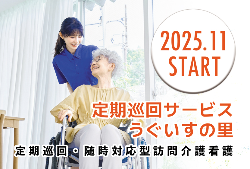 今秋、うぐいすの里は新しく「定期巡回・随時対応型訪問介護看護」の事業をスタートしました。従来の訪問介護サービスとは違い、より柔軟に、より的確に、ご自宅での支援をする訪問系の介護サービスです。施設ケアのように、5分から15分程度の「定期的な支援」が中心で、1日の間で、複数回訪問することも可能です。通常は契約内容に沿って巡回していきますが、緊急の場合は、専用のオンコール端末を使って、一時的なスポット支援を要請することもできるという<24時間対応型>のサービスになっておりますので、家で暮らす方、外部の介護保険サービスが使える施設に入所されている方など、地域で暮らす多くの皆さまにとって、大変心強い介護サービスでございます。詳しくお知りになりたい方は、ご担当のケアマネジャー様にご相談ください。